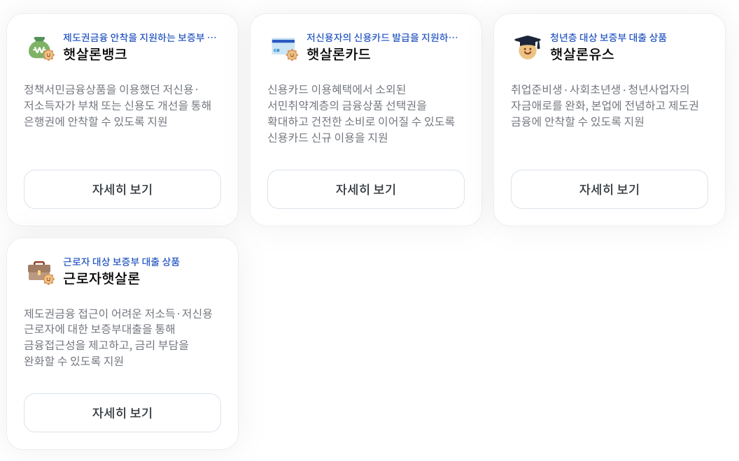 - 햇살론, 미소금융, 청년전용 상품 등 다양
